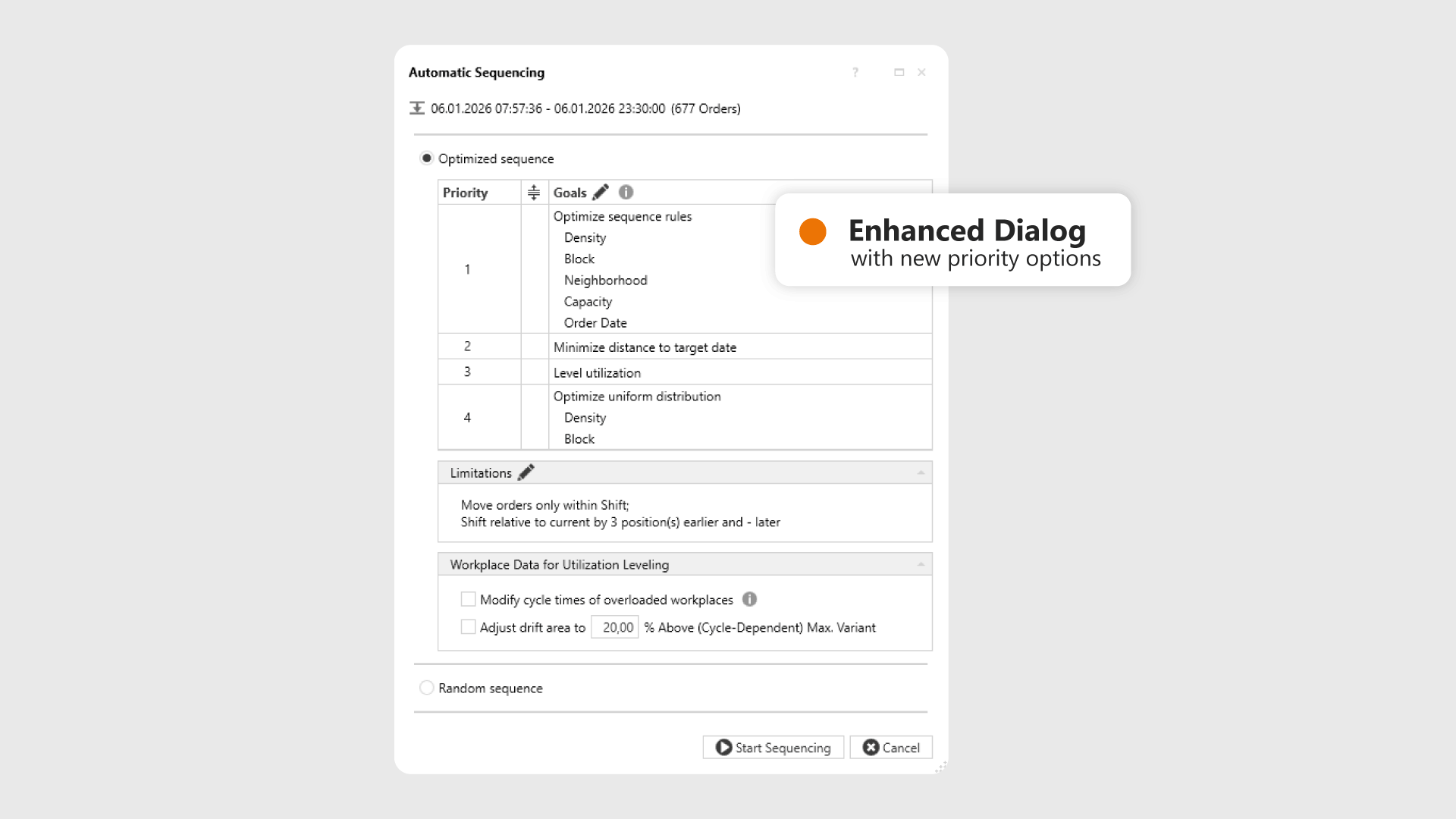 Der Herbst bringt frischen Wind in SEQUIQ! Mit dem neuen Release steuern Sie Ihre Sequenzierungsziele im komplett überarbeiteten Konfigurationsdialog individuell – und pflegen im Workflow Auftragsbestand zentrale Regelsets mit zeitlicher, stations- oder planungsstufenspezifischer Gültigkeit.