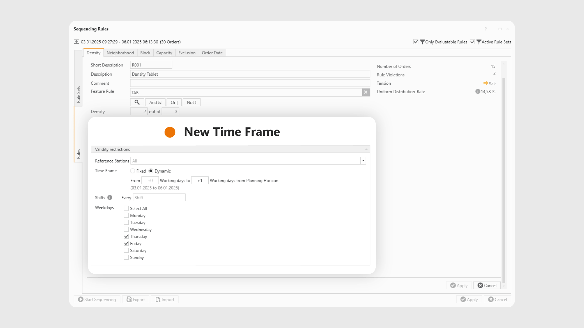 Die dynamischen Zeitbezüge stehen im Workflow Auftragseinplanung mit Auftragsbestand zur Verfügung. Dort gibt es unter Dokumentieren /Reihenfolgeregeln bei den einzelnen Regeln einen neuen Bereich „Gültigkeitszeitraum“. Hier stellen Sie komfortabel den dynamischen Bezug ein